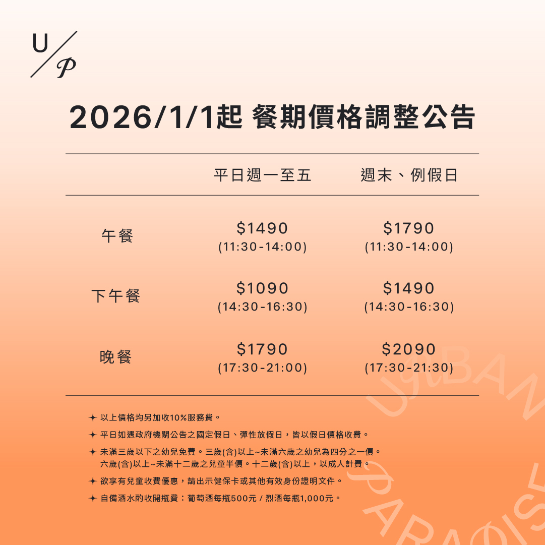 URBAN PARADISE 將於2026年1月1日起調整餐期價格。