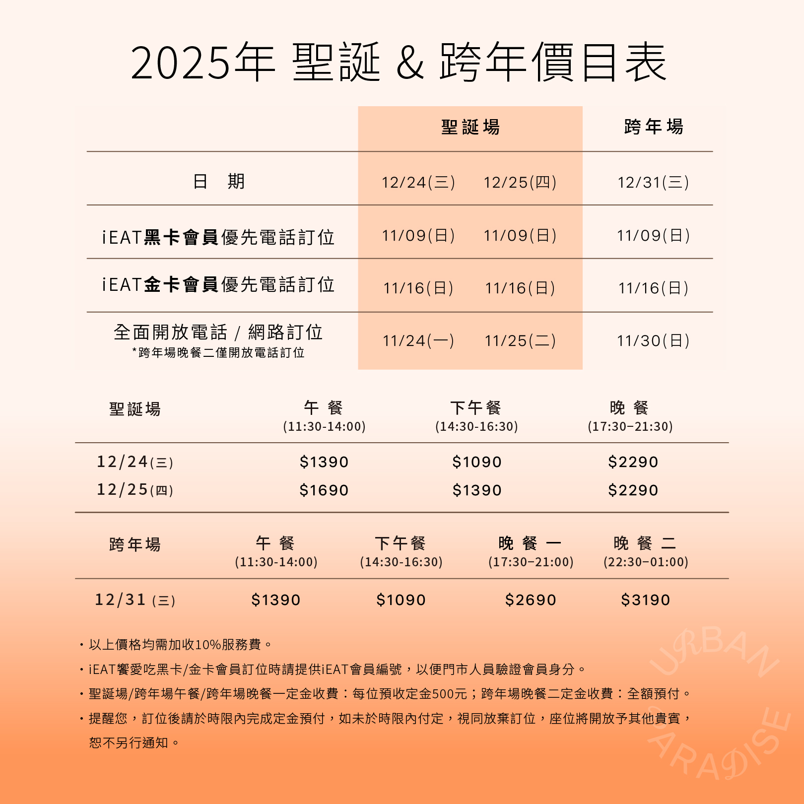 ◎ 聖誕場/跨年場午餐/跨年場晚餐一 定金收費:每位預收定金500元;跨年場晚餐二 定金收費:全額預付。